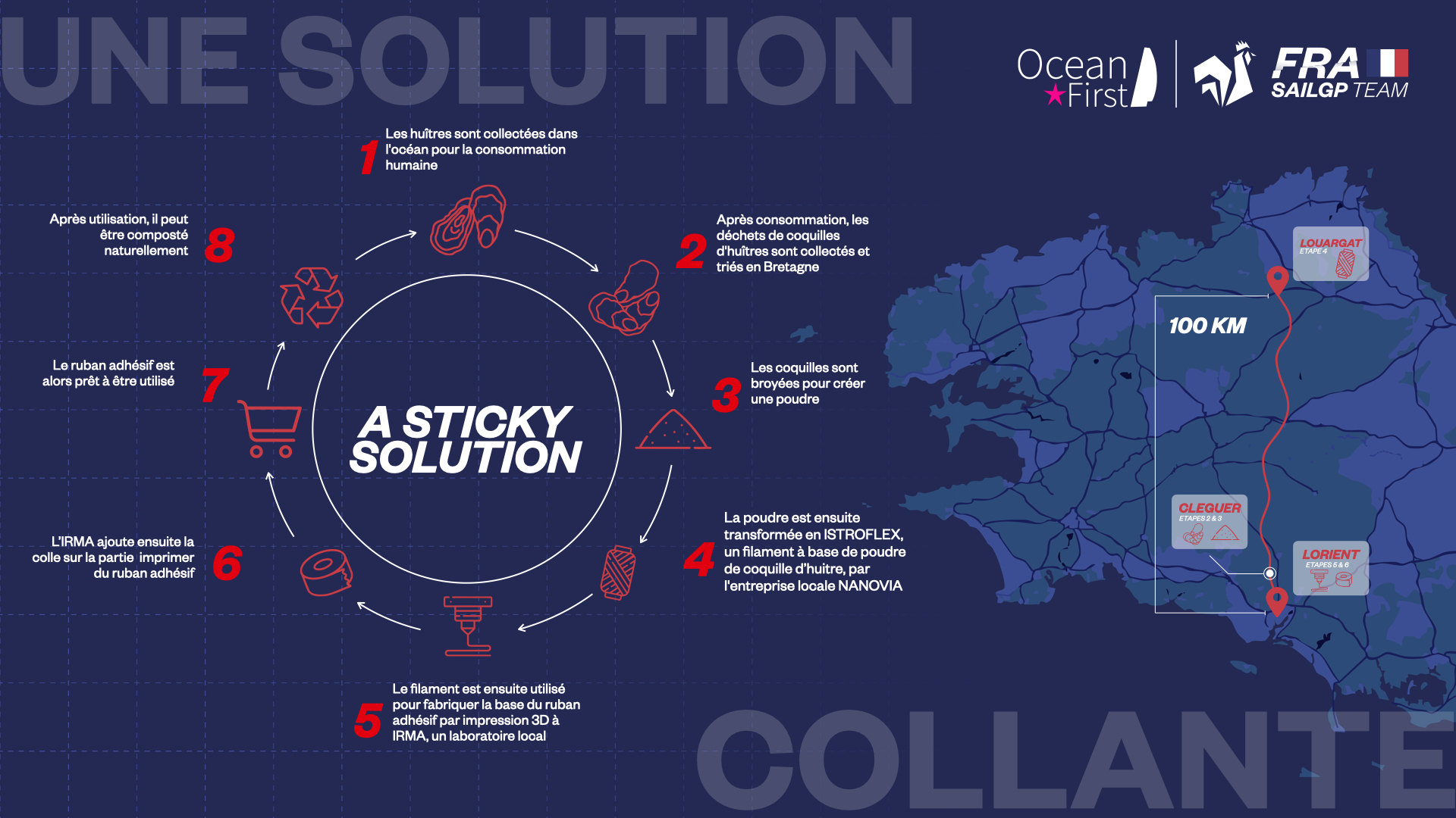 Projet 1 - La course vers le zéro déchet : Développement d'un ruban adhésif, issu de l'économie circulaire, fabriqué à partir de poudre de coquilles d'huître et d'une colle biodégradable pour remplacer le ruban adhésif traditionnel, en collaboration avec la start-up Ocean First.