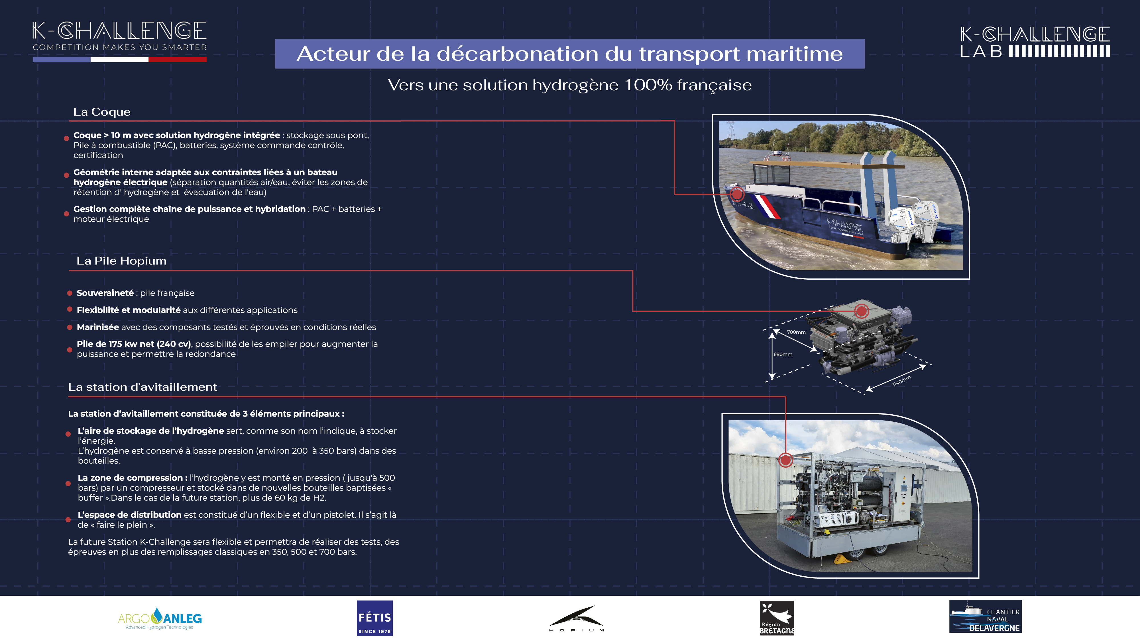 Avec le soutien de la Région Bretagne, K-Challenge Lab et ses partenaires - Hopium, Argo-AnLeg, Kinelle (Fetis Groupe) portent un projet ambitieux : concevoir et démontrer une solution de propulsion hydrogène marinisée fiable, réplicable et adaptée aux usages réels du maritime, en particulier pour les navires de travail.